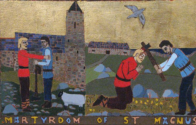 So it was that Magnus, then eighteen, found himself in a warship in the Strait of Menai preparing to attack Anglesey. He refused to fight preferring to sing psalms standing exposed, open to the danger of battle. After an enforced exile until the Norwegian king died, Magnus returned to Orkney to reclaim his share of his inheritance taken by Hakon. A joint rule lasted a few years, but disputes arose. Magnus arranged an Eastertide meeting for peaceful negotiation using the good offices of Bishop William “the Old”; Hakon had other means in mind, arriving with eight ship filled with warriors. Magnus made no attempt at defence or flight, but fell to prayer in the church on Egilsay. Hakon had him seized and killed.