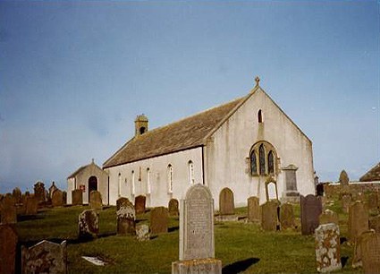 When the floor of the church was taken up during alterations in the early 1900s, two very old gravestones were found. One is now beside the pulpit. The inscriptions are now illegible, but there is a rough coat-of-arms and the date 1645. The other stone stands in the vestibule. The stained glass window installed shortly after 1900 was designed by Mrs. McPherson, wife of the minister, and made by Alex Strachan, whose brother designed and made one of the windows for St Magnus Cathedral, Kirkwall.